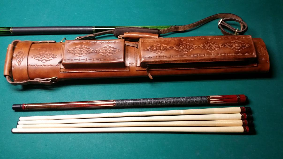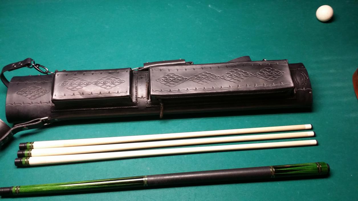Green cue comes with three shafts and black bag. $2600. O.b.o.