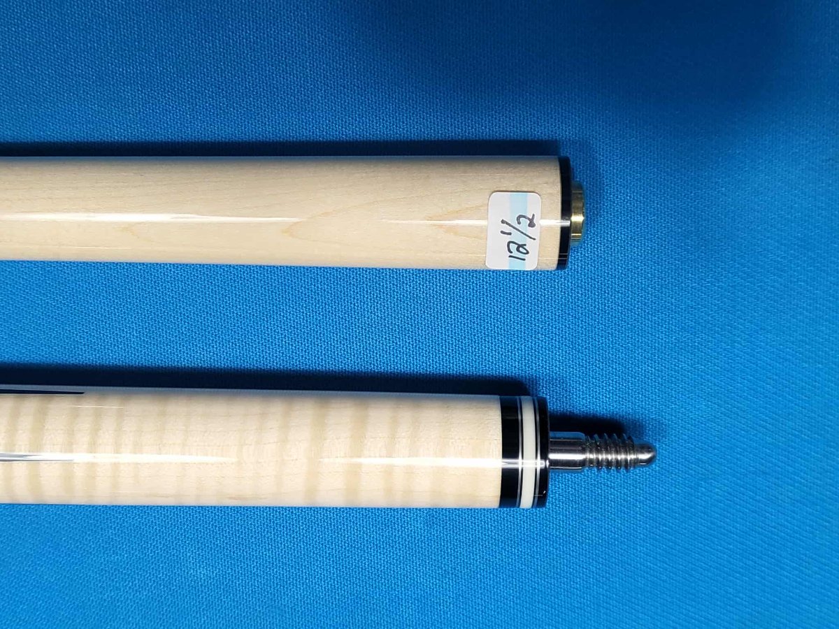 A figured maple shaft with simulated ivory stars, red sparkle and blue pearl inlay stripes, and a wine stained wrap section.