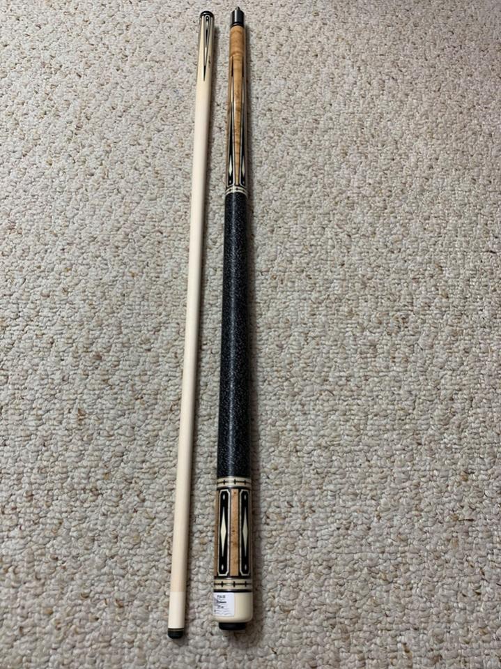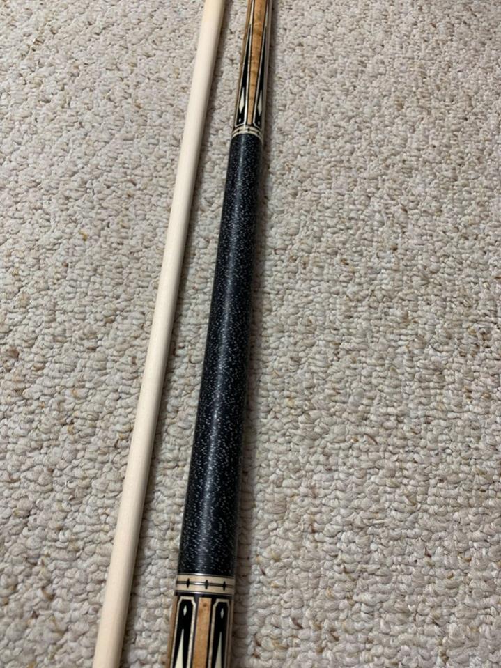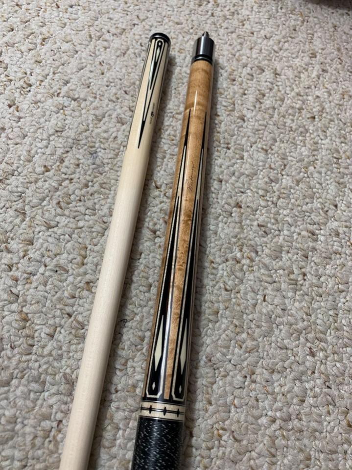 Natural stained Bird’s-eye Maple cue with 4 Sim Ebony framed maple and Sim Ebony points with sim. Ivory diamonds. Matching boxes in butt sleeve. Maple trim rings with Sim Ebony diamonds. Irish Linen wrap.