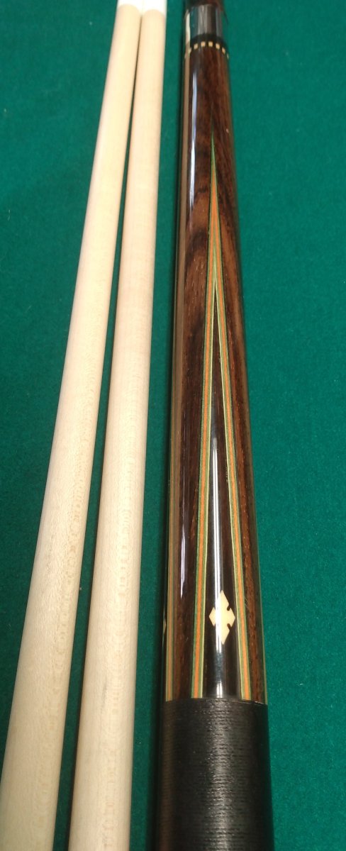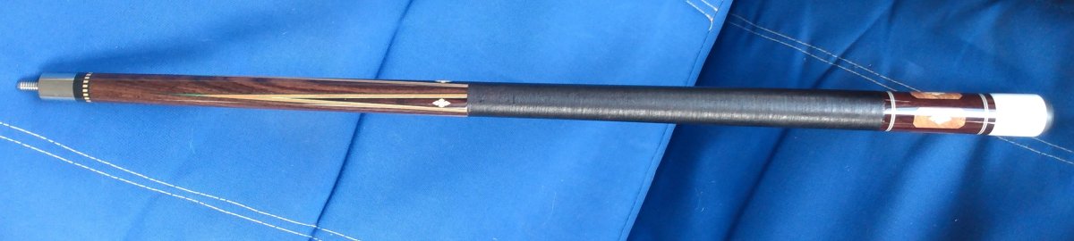 FOR SALE IS A LIGHTLY PLAYED PHILLIPPI ROSEWOOD AND DARK ROSEWOOD 5 VENEER POINTS WITH BURL WOOD INLAYS IN THE BUTTSLEEVE. A TRULY BEAUTIFUL 58 INCH CUE. BUTT IS WRAPPED 15.50 OZ 29 INCHES. SHAFT 1 IS 4.05 OZ 12.40 MM AND SHAFT 2 IS 3.70 OZ AND 12.60MM. 5/16X14 PILOTED JOINT. INCLUDES CUSTOM 8" EXTENSION.