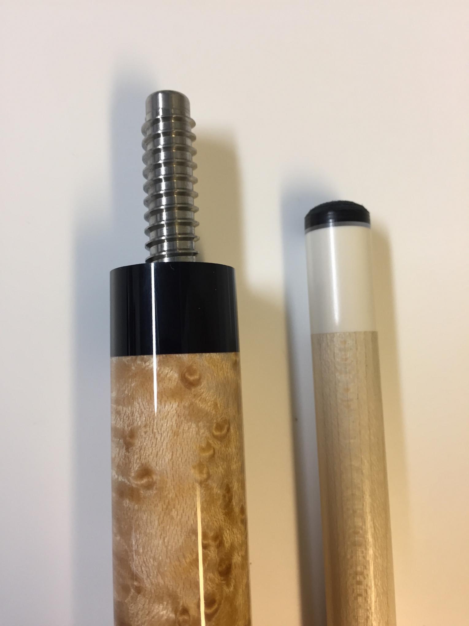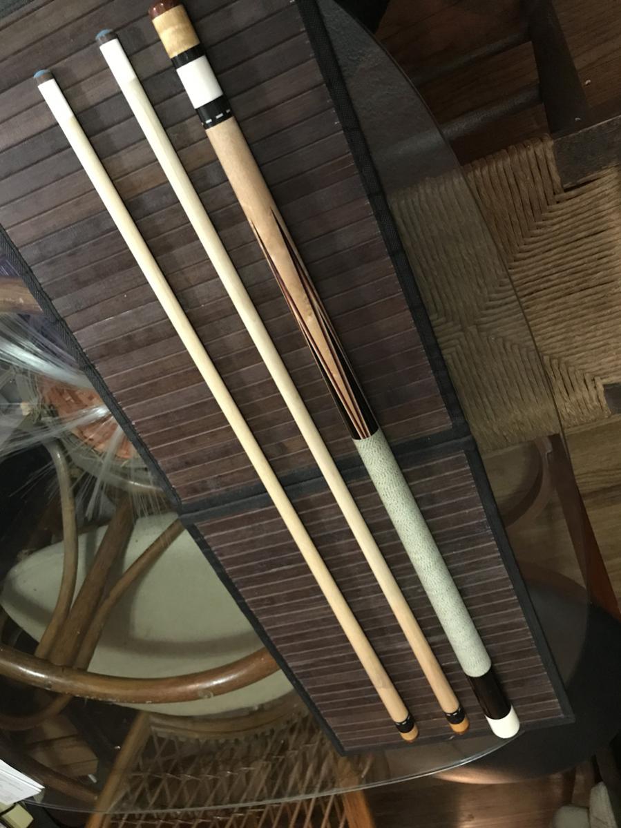 As pool became my main hobby about two years ago, I've acquired a lot of equipment over this time due to continually trying and testing new things to find what worked best for me regarding all cue parts: tip types/shapes/hardness, shaft diameters/tapers/lengths, laminated vs one-piece, LD vs traditional maple, joint preference (not necessarily the pin type for me as I like them all, but more concerning stainless vs implex joint collars), wrap type, cue design, wood preferences, different weights, etc).