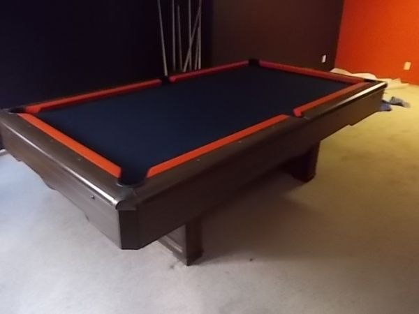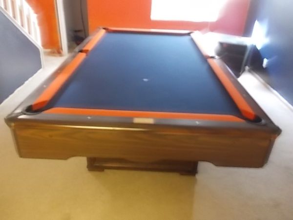 That appears to be the Play Master 'Holiday' model. High pressure laminate top rail over solid wood, 3/4" or 1" unbacked slate, probably a Douglas Fir frame, K66 cushion rubber. Should play similar to the AMF Savannah, as construction is nearly identical. The leg posts bolt directly to the main support beams. Bump against the end if the table to insure it's solid (no rocking).