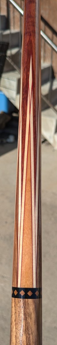 That is really awesome. I'm sitting here looking at all the angles and how it comes together. I don't know exactly what i am looking at as a non cue builder. But I assume what i am seeing is red paper? outlining the white maple. it makes for a very eye pleasing effect creating a diamond at the point. If the light maple veneer was thinner would it look even nicer? but then it would mess with the angles of how the diamond looks at the top.
