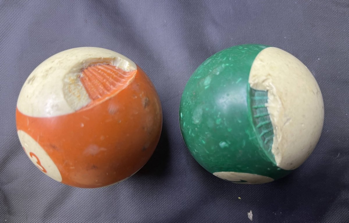 Just one more observation on these sets. I have 6 different sets. None in the bad shape of yours, but some that have minor damage. The sets that have minor damage were either missing their cue balls of had been replaced with a Polly or phenolic cue ball. I think the weight difference and hardness of the replacement cue balls caused most of the damage to these types of sets. Original cue balls for these sets are very hard to find and most are in really bad shape.