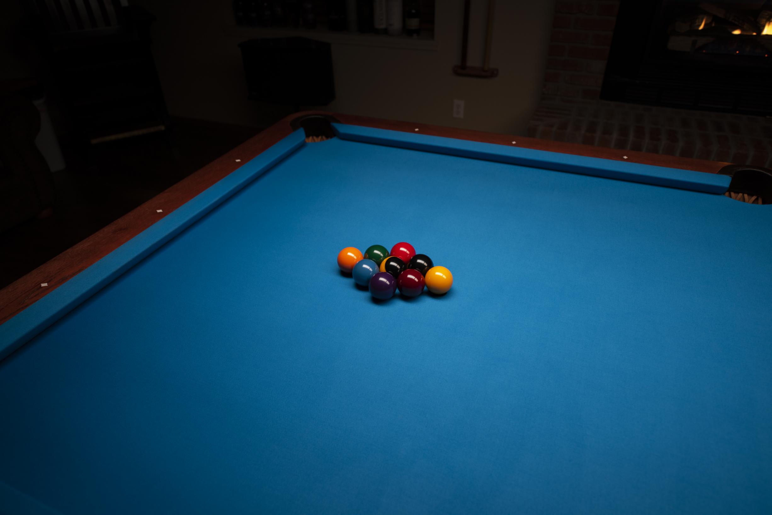 As I previously mentioned, the wonderful Raschig 9 Ball set inspired me to put on that new Simonis Tournament Blue cloth and replace my nearly 20 year old Artemis cushions on my 9 foot Diamond Professional table...which I did this weekend. I am the second owner of this lovely table and, despite having the cloth in hand when I acquired it three years ago, kept the almost like new Camel colored cloth on it as there was nothing wrong with it. I do think the Raschigs look even better on the blue background, although that is certainly my personal view. And, while I would never have considered my cushions dead, there is certainly an additional table length off a hard struck cue ball with the new ones!