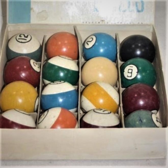 A. It is rather depressing to ponder upon the countless hours I have spent online in a forlorn quest to obtain this wonderful curiosity. Four contrasting designs grouped together to form a pool ball set that, in my view anyway, is something of exceptional beauty and interest. To the best of my knowledge the grainy photograph above is only the second such image ever to appear anywhere on the world wide web, a copy of the original eBay listing dating way back to 2003. I want these balls bad, dear reader. Any leads at all, no matter how remote they may seem, would all be most gratefully received.