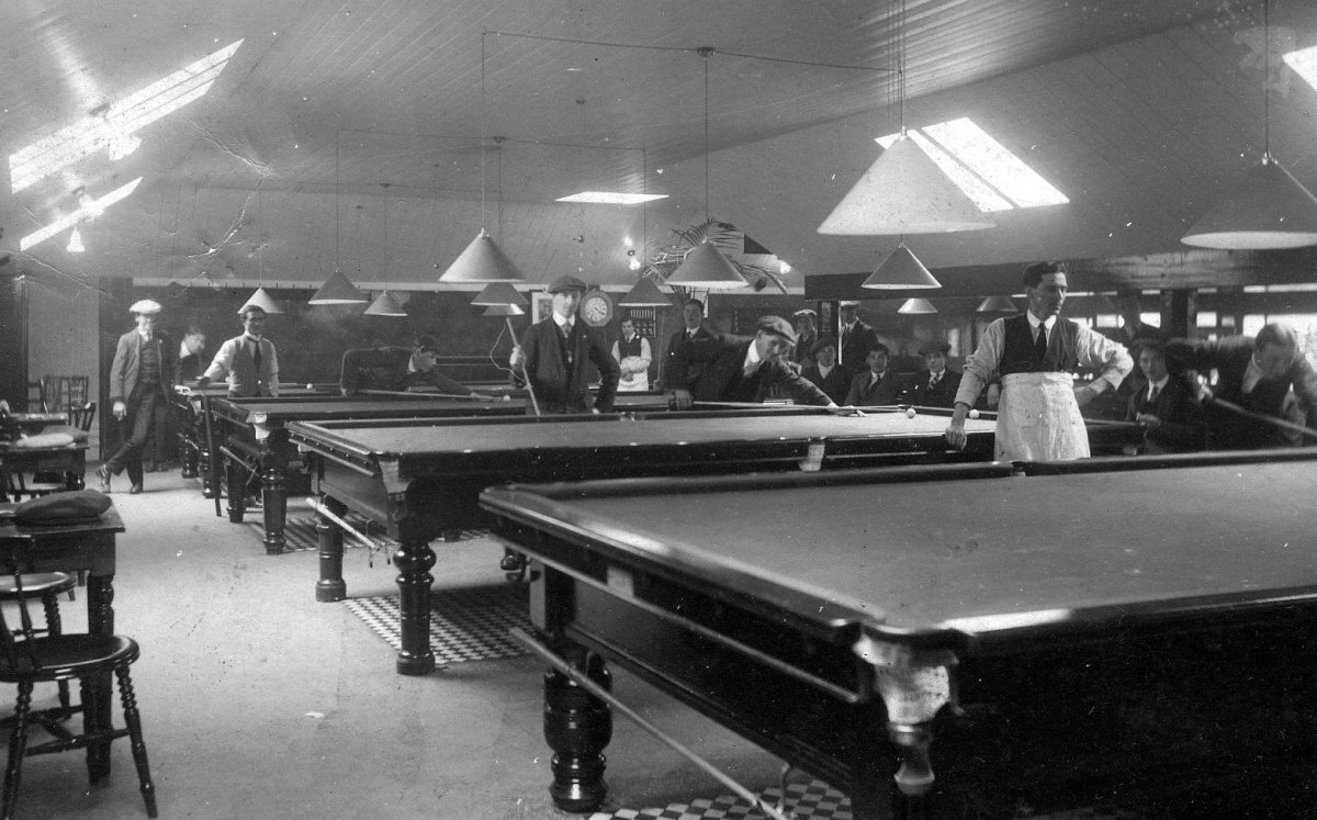 They look like 6x12 snooker tables.Does anyone have any information on this old photo? I don't remember where I got it. Possibly AZB some years ago. Notice the 45 degree skylights, long tables and b&w tiles under the tables. Almost everyone is wearing a tie.