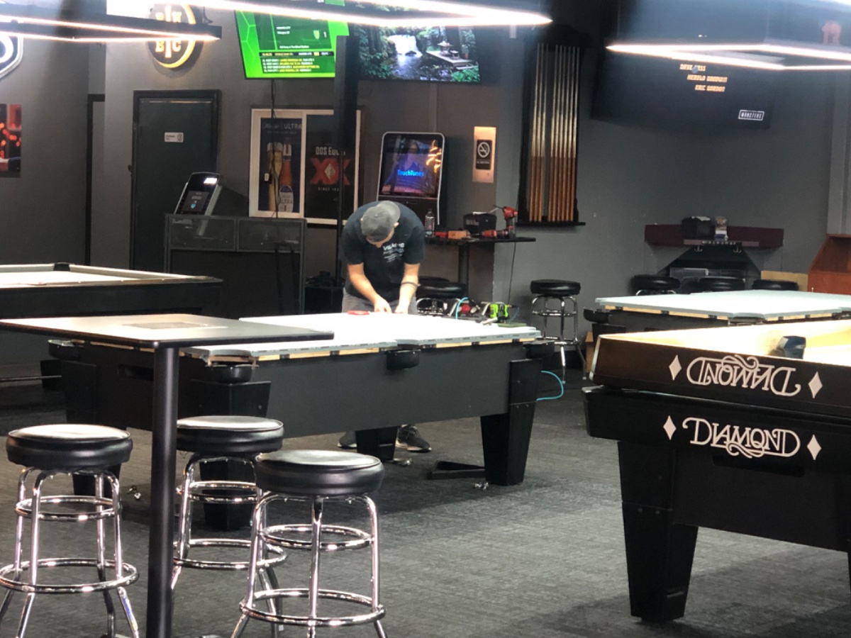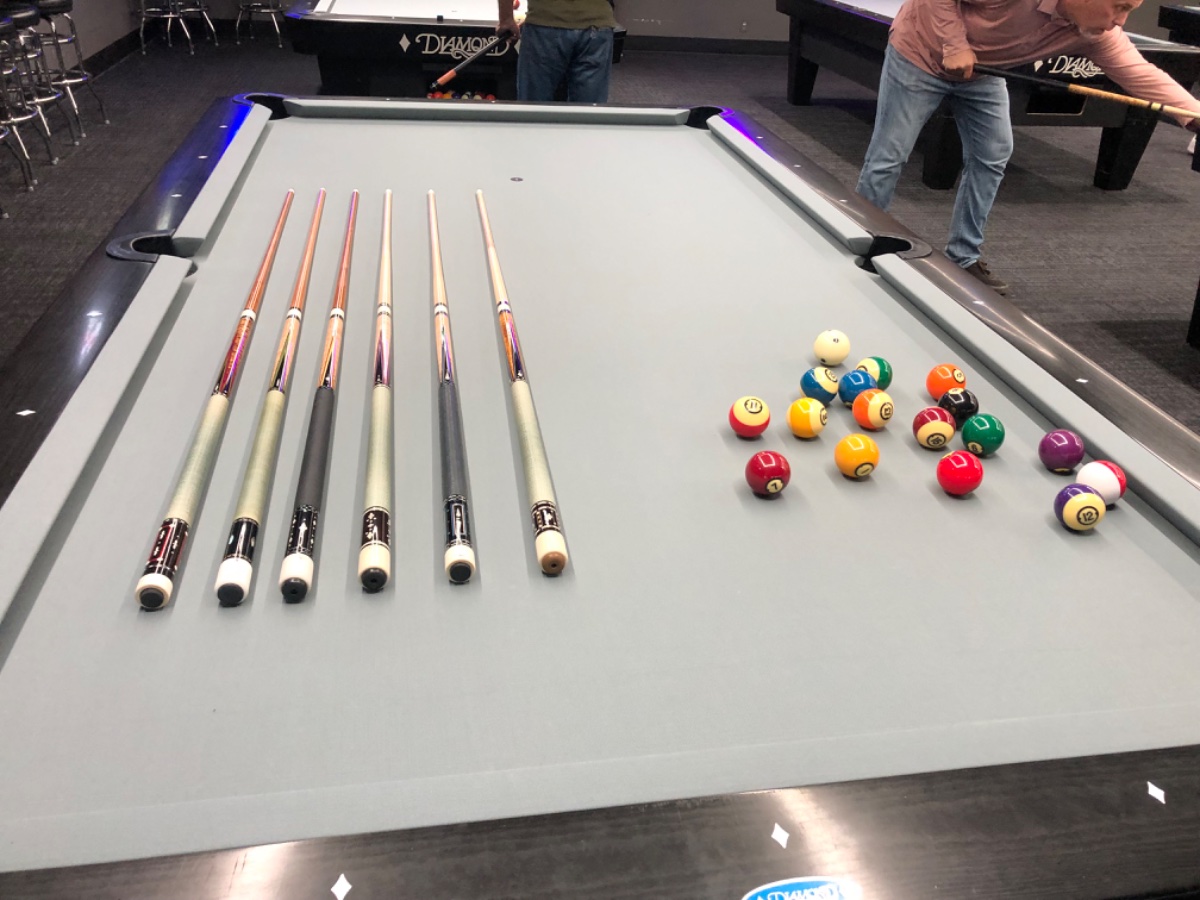 The new location is progressing on schedule and so when they ordered the new tables, the owners decided that the existing location should recover the tables and decided to use gray cloth as well. I do not like the color choice and IMO, it will look like crap a year from now. However, one thing I will readily concede is the installation being performed that will be finished today is by far and away the best installation of pool cloth I’ve ever seen and that includes home tables. It is absolutely immaculate and one mechanic did all the tables by himself. Apparently, aside from being a former top pro pool player, his table workmanship also distinguishes him as being the best. Oh well, the color sucks but it is the finest cloth installation I’ve ever seen and the pool tables are in amazing shape. I tried to get one of the 9’ table pocket size reduced to 4” from 4.25” but got outvoted by some of the regulars who convinced the owner not to do it. They also happen to be players that like playing on the tables with 4.5” corner pockets.