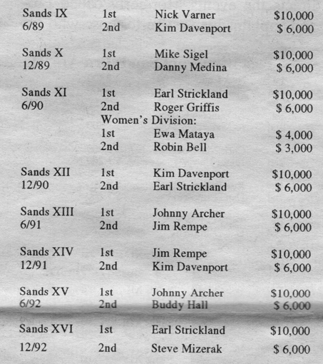 May I just confirm the year of the Hollywood Open and the Sands Regent that took place shortly afterwards please? According to my research, the only time Roger Griffis was in the finals of the Sands was in June 1990 (SRO XI) and he lost to Earl in the finals. He did beat Efren 11-9 on his way, though. Thanks again Jay!