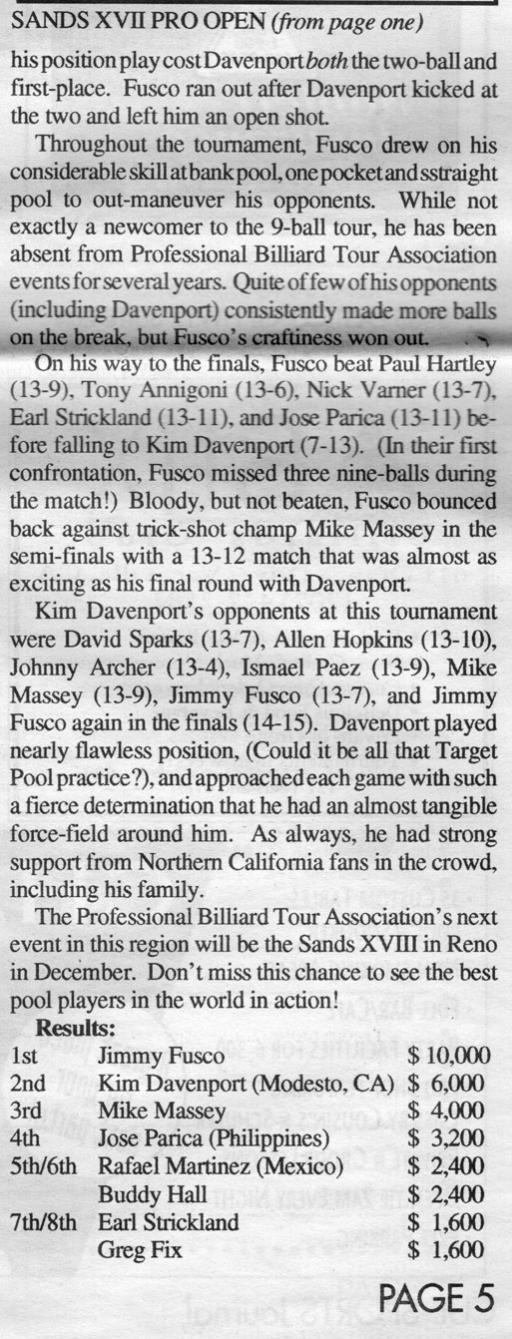 I'm currently compiling a list of all Sands Regency Open winners, runner-ups and 3-4 place finishers. The ultimate plan is to post an article on wikipedia. Being a gold member, I do have access to The National Billiard News but they don't cover all of the SROs.