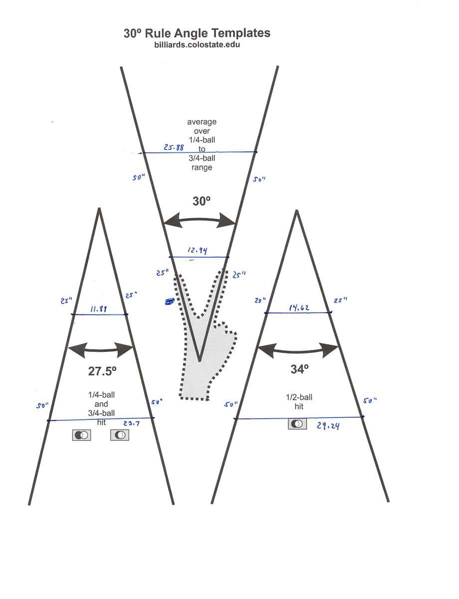 That would mean (if I understand you) that all CB carom angles would be equal to their cut angles but on the opposite side of the "shooting line path". We can see from Bob's plot above that's not the case - for instance, a 30° (half ball) cut has a CB carom angle of 34°. The thinnest cuts (close to 90°) have carom angles close to 0°....If one formed an isosceles triangle from the center of the ghost ball, with one leg extending the shooting line path (i.e. extending the line from cue ball past the ghost ball), with equal legs of two diamonds (25"), the length of the base of the triangle would accurately predict how far off the shot line the cue ball would be at 2 diamonds after contact for a rolling cue ball. Is that correct?