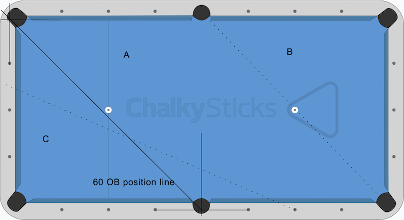 I think the 60 line in Zone C might run from the bottom side pocket virtual diamond to the left short rail virtual diamond marked by the crossing lines in the diagram above. The left short rail virtual diamond is found by: