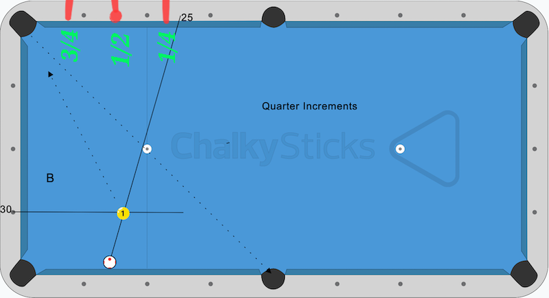 I had a little trouble with the Quarter Increment Scale for this shot because for Zone A shots the "object ball position line" intersects the long rail, where the Quarter Increment Scale is positioned, while for this shot "the object ball position line" does not intersect the long rail.