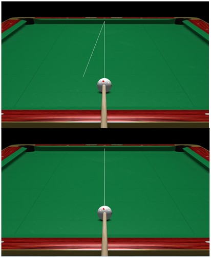 If you have chosen a particular line of aim and then use the "E" key to apply side spin, the cue stick pivots about an appropriate point to help compensate for squirt.