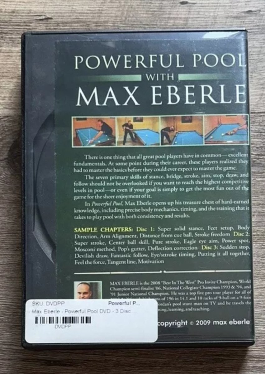 In this 3-DVD set, professional player Max Eberle opens up his treasure chest of hard-earned knowledge, including precise body mechanics, timing, and the training that is required to play pool with both consistency and results. There is one thing all great pool players have in common and that is excellent fundamentals. Max's focus throughout this DVD set remains on the Seven Primary Skills and he takes them, and you, to a world class level. Super solid stance, Feet set-up, Body direction, Arm alignment, Distance from cue ball, Stroke freedom, Super stroke, Center ball skill, Pure stroke, Eagle eye aim, Power spot, Mosconi method, Deflection correction, Sudden stop, Fantastic follow, Eye/stroke timing, Motivation and more.