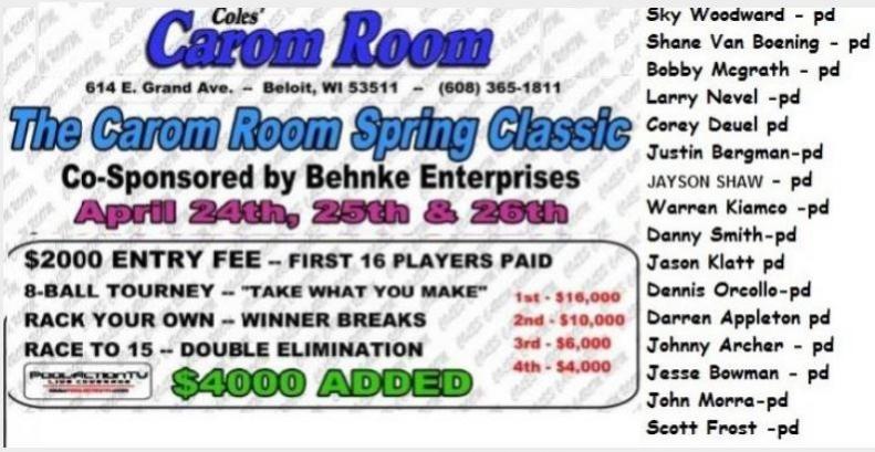 Ray how about Scott Frost vs Dennis Orcollo they were talking about playing 1 pocket at DCC this is the match everybody wants to see.We are also looking to put together a 2 man tournament right after this one.