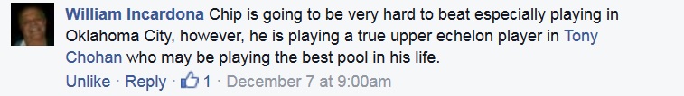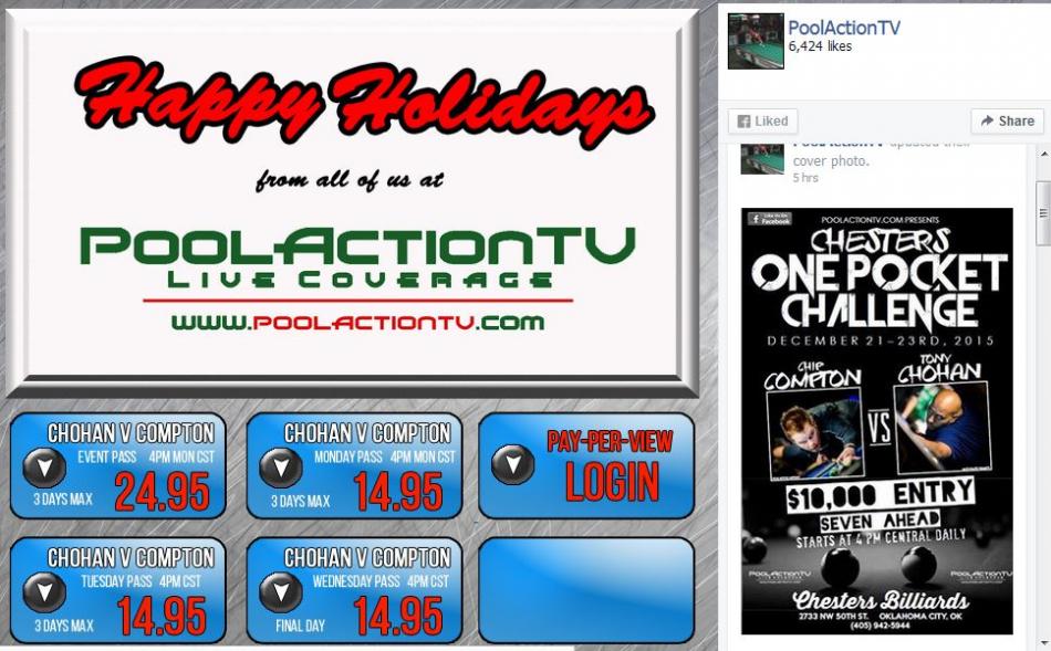 Starts today 4pm central Tony has been on fire in these heads up matches the last few months Chip's going to be hard to beat on his home table Both guys play very a aggressive high power one pocket style get a pass and sweat the action Get a pass @ www.PoolActionTV.com