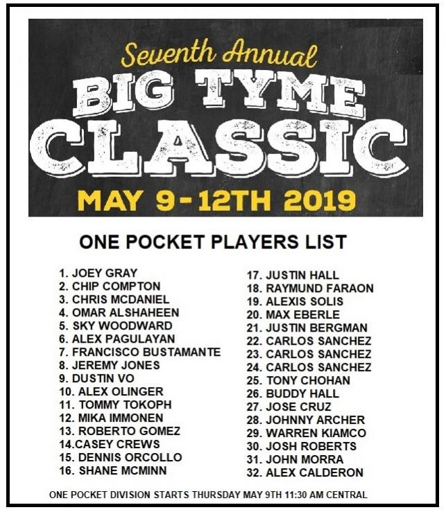 7th Annual Big Tyme Classic kicks off today, Thursday at 11:30 am with The One Pocket division.