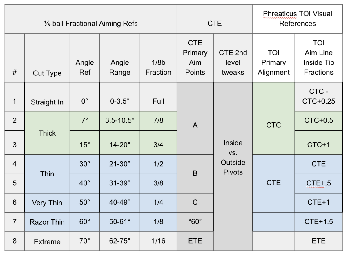 I completely concur with Hal's statement, and as we know CTE really actually has 4 primary aimpoints, Thick = A (15°), Thin = B (30°), Very thin = C (45°), and the Razor Thin (1/8b!?) cut ref for 60+° angles (For some reason they don't name it "D", never understood that…) Over time, the concept of inside & outside pivots was introduced, so essentially they have 4 primary aiming refs, each with 2 modifiers, meaning 4x2 = 8 effective aimpoints or angles are actually used. The mapping to 1/8b fractions is rather obvious, when seen from this perspective, yes? Again, all of this is decided subjectively by the shooter, and most of us understand that all this happens via feel & progressive experience. [insert violent apoplectic response & attack from Spiderboy or Cookieman here...]