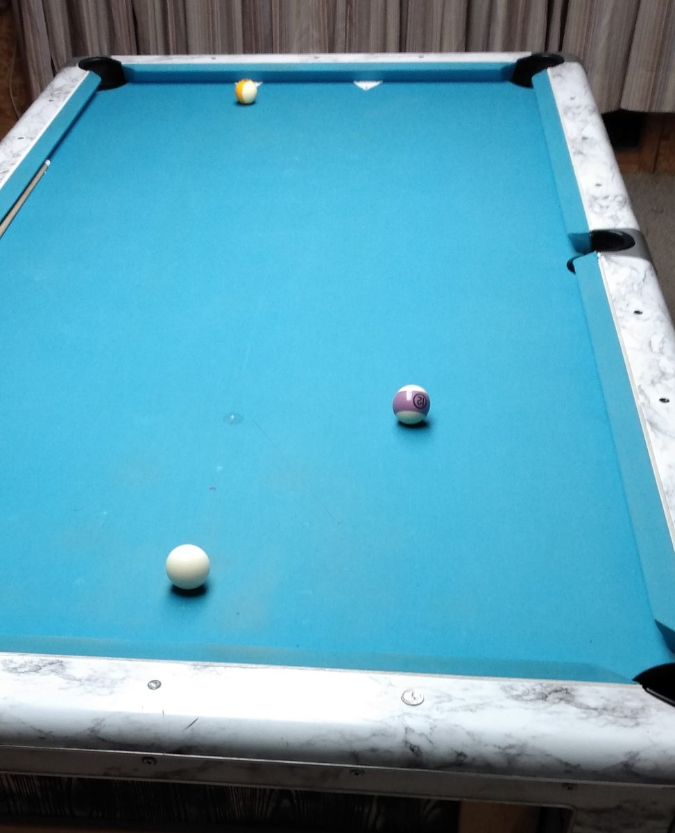 Playing one pocket on her. I had hung the game ball with only one other ball on the table. That ball was a diamond and a half out and half diamond off the foot rail. My opponent made the hanger and went in with it. Putting 2 balls together on the spot. Leaving me my practice shot 🤷 So I made it leaving the other 2 undisturbed. My opponent on the other hand got so disturbed that he lobbied to have the table.....uh fixed. The pockets were not right(too tight!). It worked! Diamond gave them a regulation 9' table as even trade for the 10'er with the defective ly tight pockets.