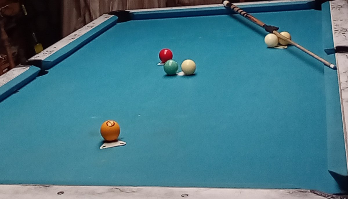 The first leg of my choice of 3 to the purple 4. A near miss of the teal 2 and the shot is there. Offers the study of rotation influence on whitey. Moving up and down the rail or hitting the same spot with different spin. Either way it's a win win. Physical and mental and it's fun. Well mostly. 😉