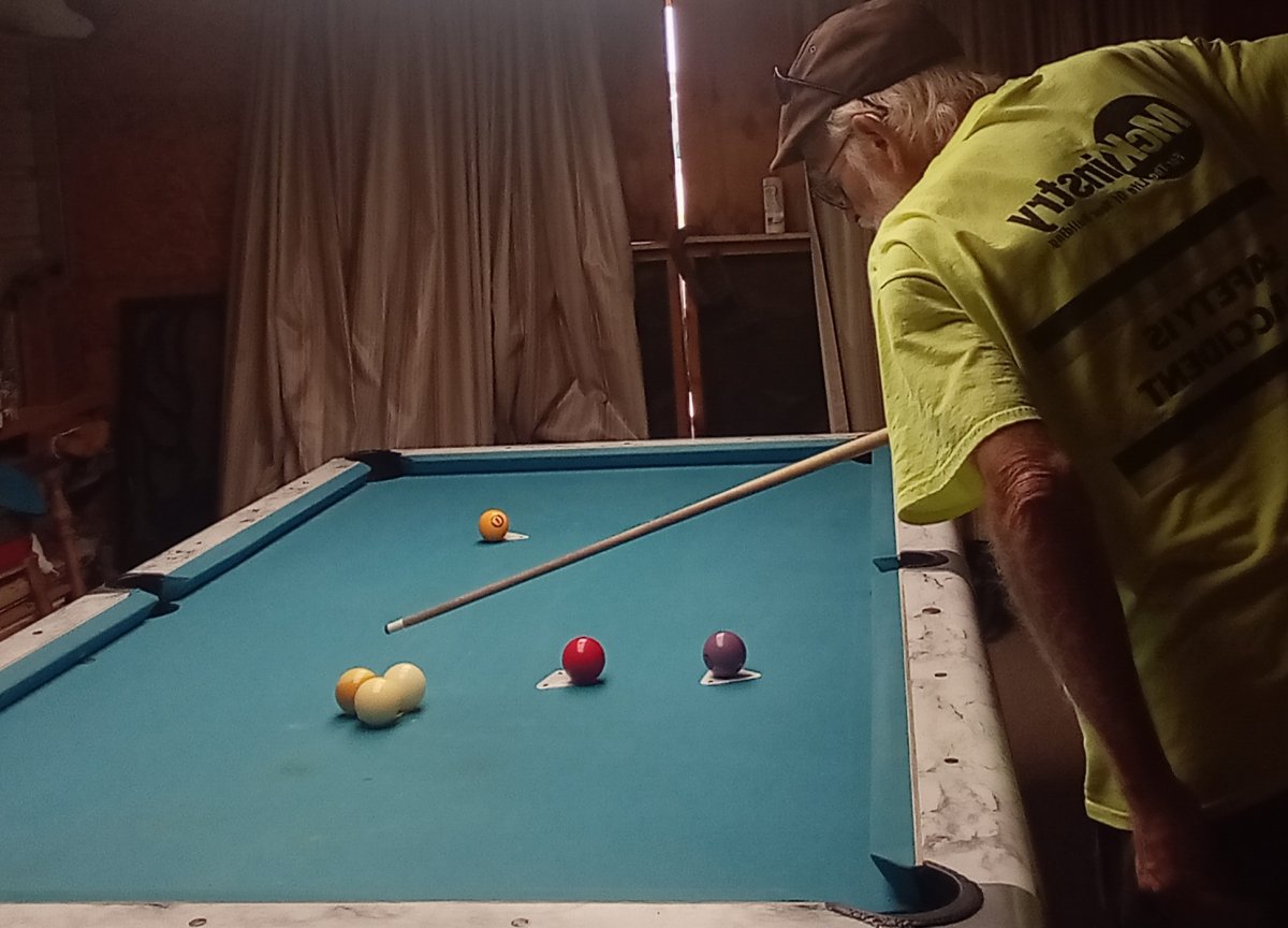 Lots of therapy in the 1 rail to the red 3. I am using the 9 ball as cue ball. The traveling cueball is .....well it made it to the car. 🤷‍♂️ I had a memory moment at leagues last night. I was unaware that I had made the table run playing 8 ball. He made a dry break. 🤷‍♂️ Well his previous game he made 3 or 4 on the Break and ran out! Playing MY wife. Grrrrrr