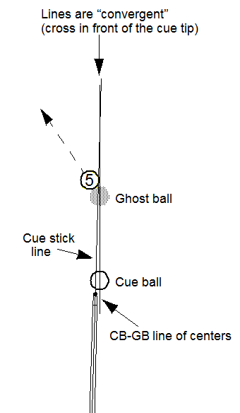 This test used a parallel cue line, the convergent cue line points back towards the center from the outside contact point,. This inflective line when input into the Ron Shepard deflection diagram finds the triangle created by the proposed offset to be a mere sliver. The cue line approaches the contact point to center of mass line, pj’s pet line.