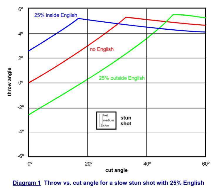 This diagram graphs a soft stun shot using 25% outside, 25% inside english and comparing the throw to a center ball stun shot without english. The focus of what this tells us about center ball is what started my journey. Look at the red no english line in the diagram. A simple center ball shot without any spin and the amounts of deviation from the physics elastic model termed ghost ball reveals a problem.