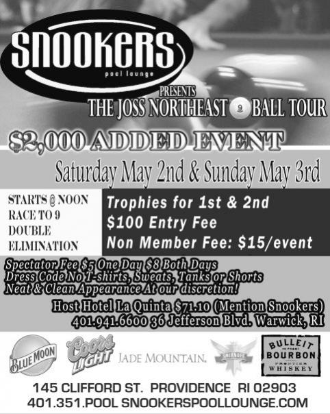 Joss N E 9-Ball Tour Event Sat - Sun May 2nd and 3rd. Snookers 145 Clifford St., Providence, RI 401 351-Pool