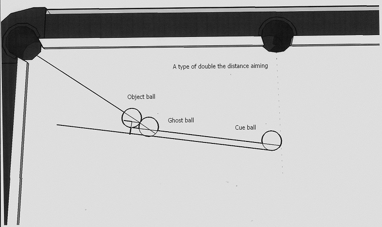 I have found that there are certain things that do not vary and are less influenced by a parallax view and they are the center of the cue, the center and edge of the OB and the center of the CB. More recently I have found that the side of the ferrule does not vary, and have started to use it more on shots where the OB and CB are close together – I aim the edge or fractions thereof of the ferrule at the double distance on and off of the OB to compensate for the failings of double distance aiming when the OB and CB are close together or compensate with outside english.