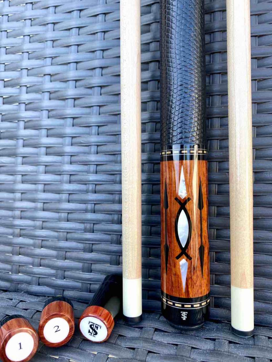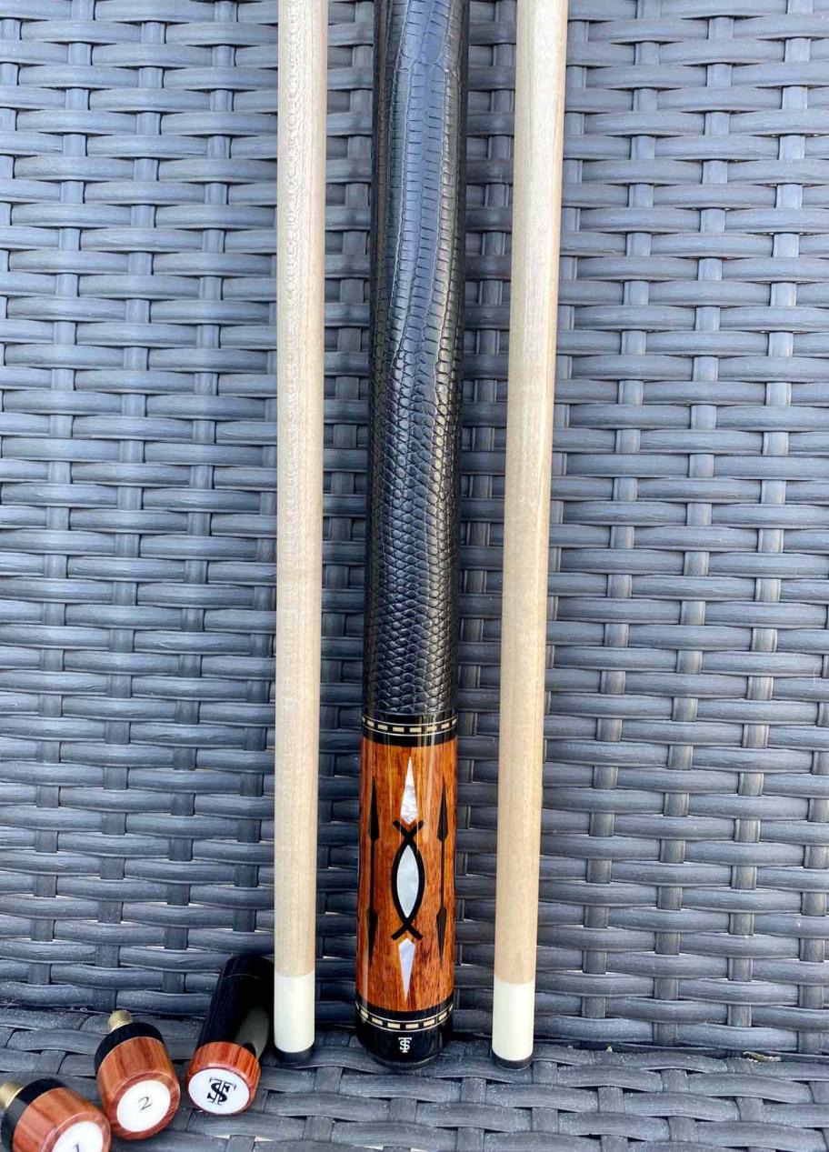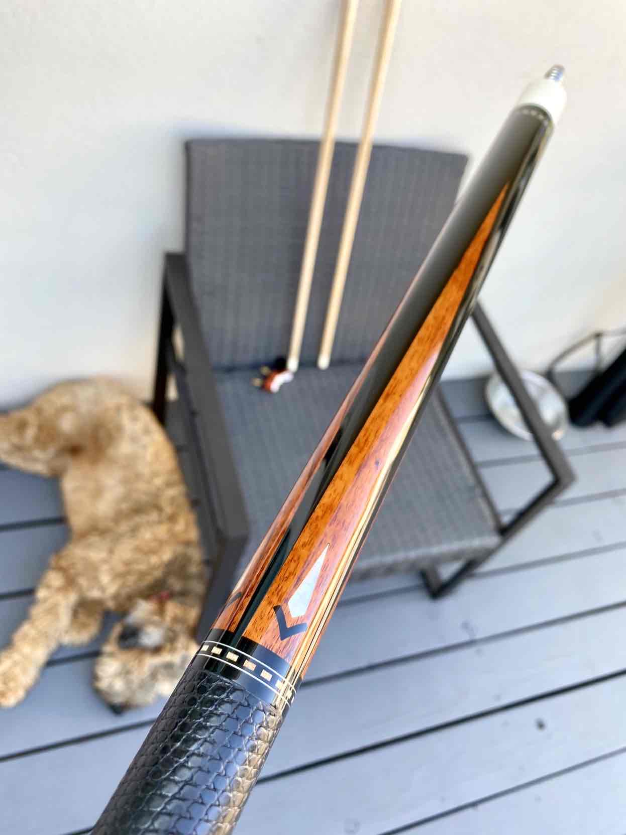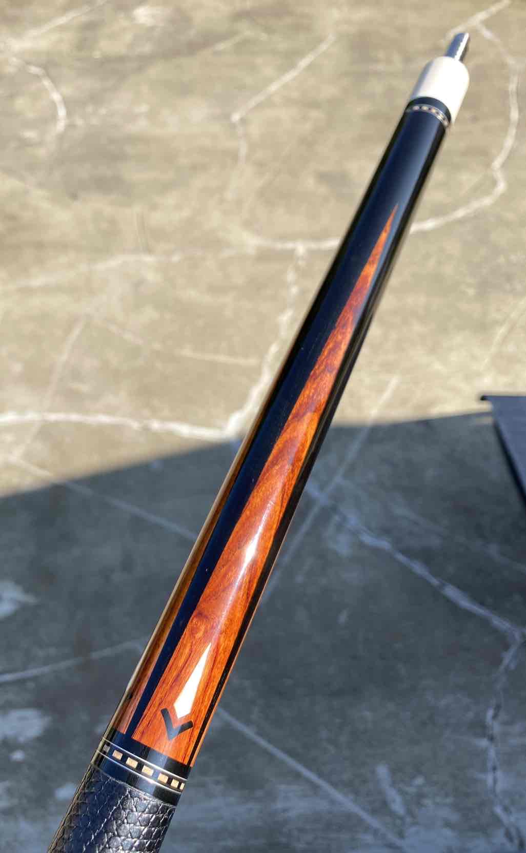 Beautiful tulipwood into super dark ebony, with 16 MOP inlays. This Scruggs also has a skinnier handle which makes it even better and more unique in my opinion. Flawless and super tight REAL lizard skin wrap. By far the best hitting Scruggs I’ve ever had.