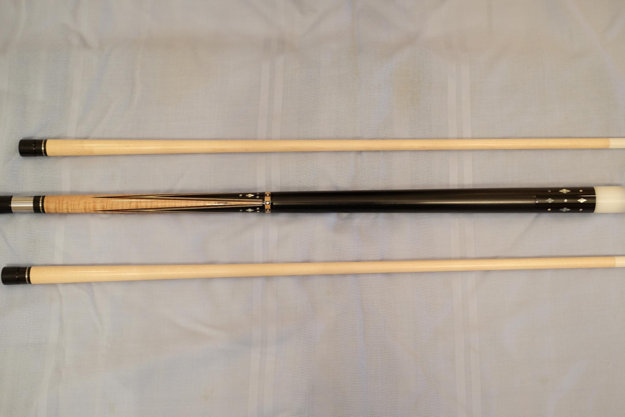 REDUCED TO $3499!!! Beautiful Pristine Bushkaesque Tascarella piloted steel joint, 4 eboney points w/veneers and 42 MOP inlays. Incredible smooth black leather wrap and Bushka ring above wrap. 2 shafts with ivory ferrules. both shafts 28 1/2 in, 13mm, 4oz ea. Overall cue 57 1/2 in and 19.3 oz. I have had this unused cue in my personal collection for over 10 yrs.