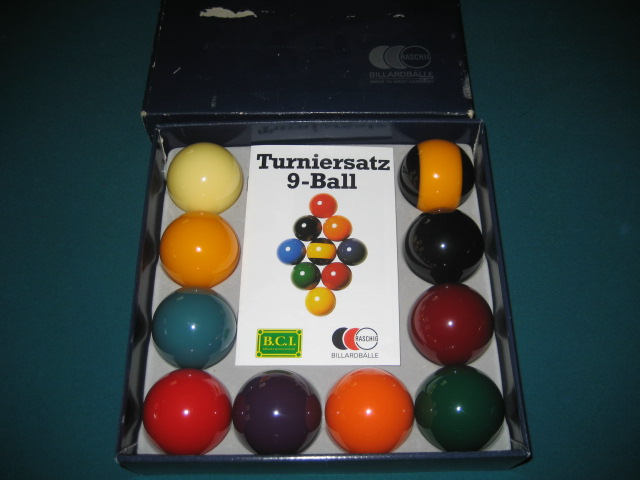 Like the title states: What's the going rate for a 9-ball set of non-numbered balls? Picture attached is not mine. Mine look exactly like this set and come with correct cue ball and blue box. I do not have the brochure, though. Thanks for the info. Josh