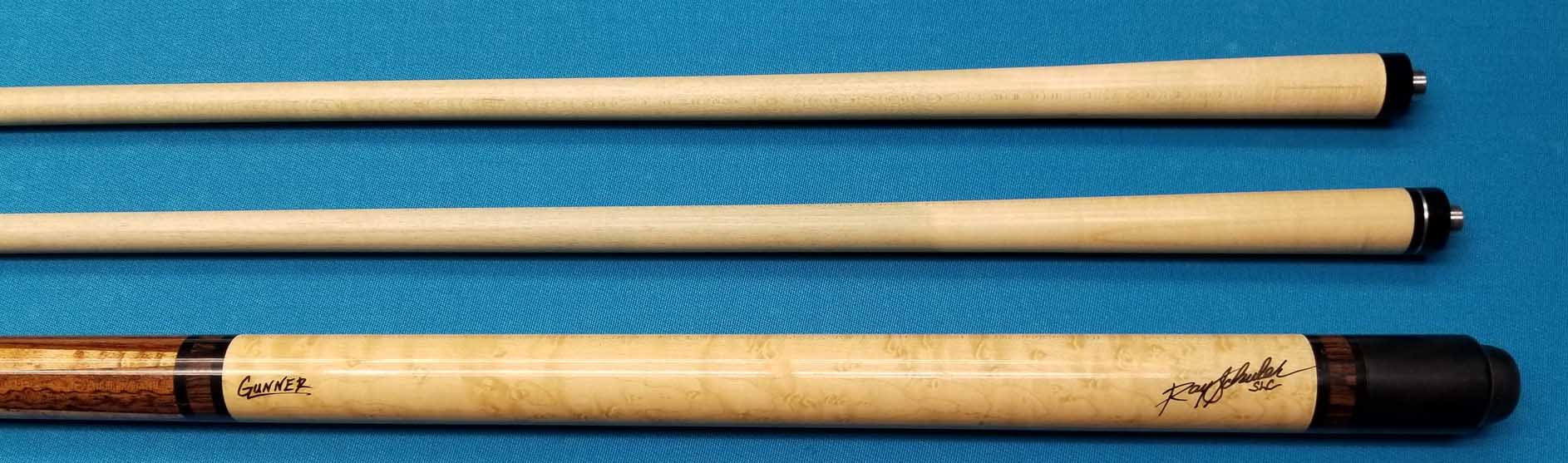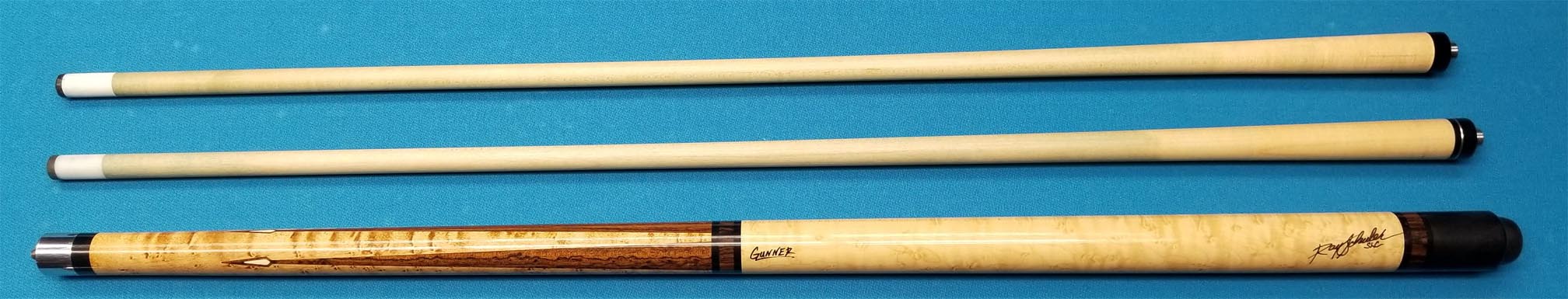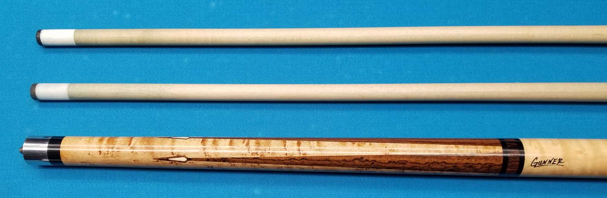 Custom made Cue. Maple with Bacote points. Nickname "Gunner" imprinted on butt as seen on picture. No wrap.