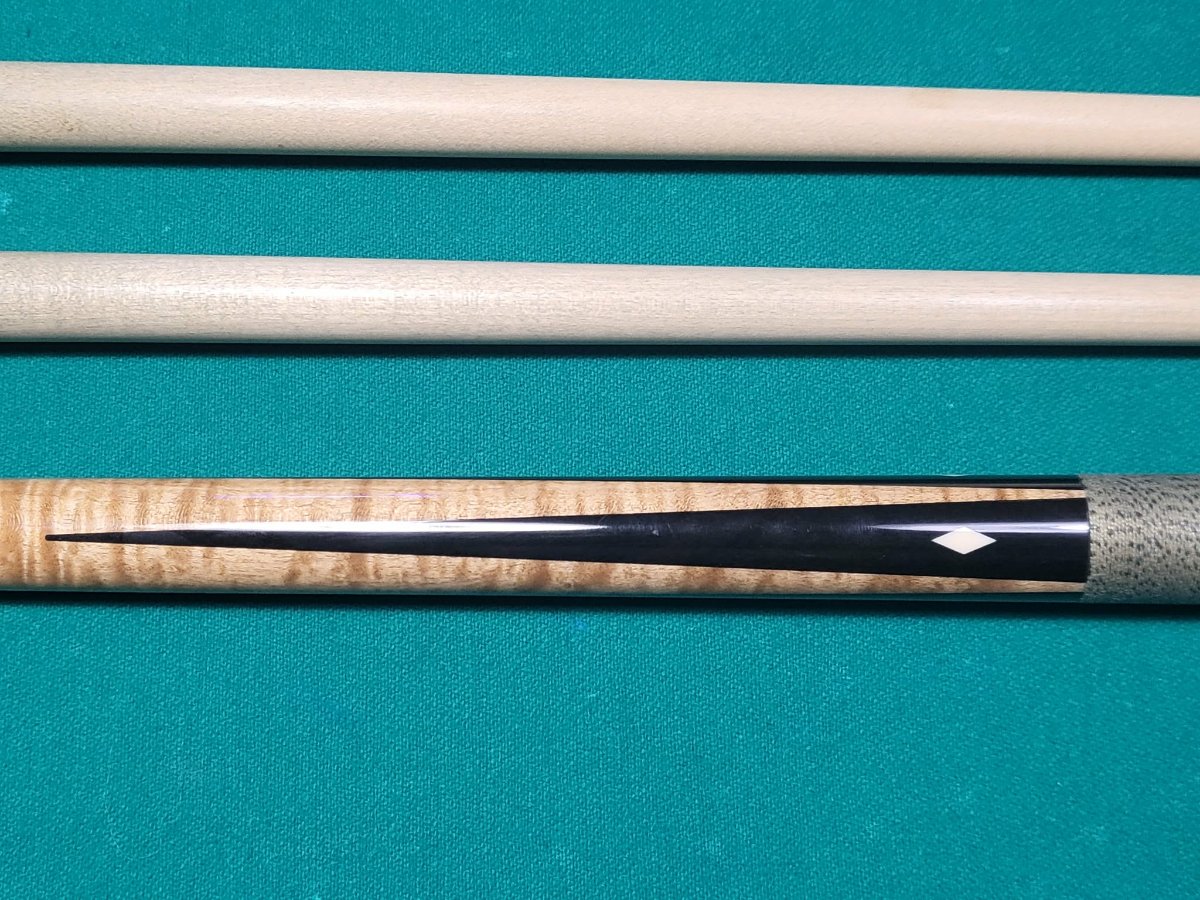 Vintage Schon with 2 shafts with dashed rings, curly maple forearm with ebony or cocobolo, butt rolls perfect, one shaft slight taper the other shaft has a bigger taper, circa 1982-86, 20.4 oz with one shaft 20oz with other shaft