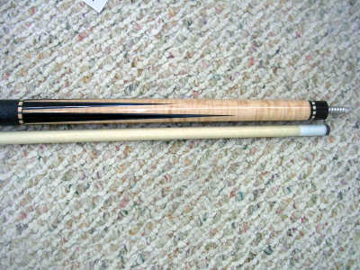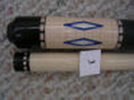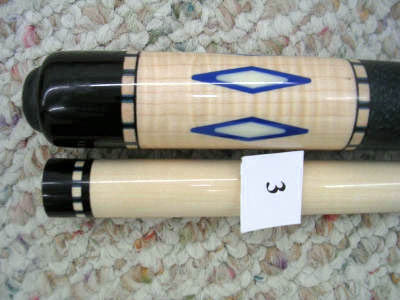3 long and 3 short points into a nice curly maple nose. The points are ebony with 2 veneer, blue and black. Rings at all locations. The butt curly maple and has 6 large diamonds with a ivory substitute boarderd by a blue plastic.