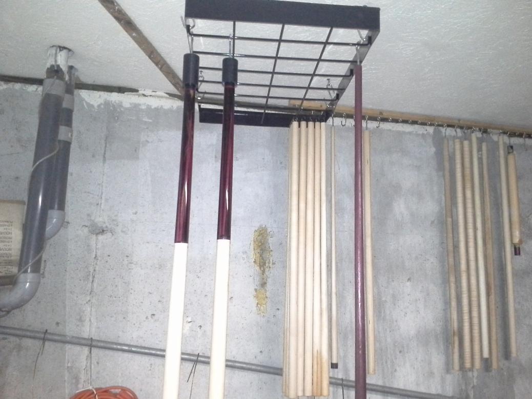 Repurposed Pan Rack: I ordered this rack to hang my copper cookware, make some room. Well it would Never hold the weight. Sooo eureka! Make it into a shaft/cue rack. Best $30 (including shipping) ive spent. There are 15 shafts in that little cluster.....time to order a few more !! Now I just need to move the rest of the shafts over and make room.