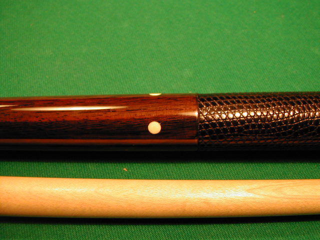 18.8oz , 1 full shaft , Ageis ferrule , medium moori tip , Dark Brazilian Rosewood , Black Lizard , 8 Ivory Dots , Brass 3/811 pin Phenolic joint , This cue came to me a little blemished. Now it's shiny. The RC3 symbol was in between coats and was possible to save. I do have a picture of it though. Trades , Make an offer , Best offer by Friday owns the cue. E-mail cueman777@gmail.com Thanx Aaron 815-243-1101