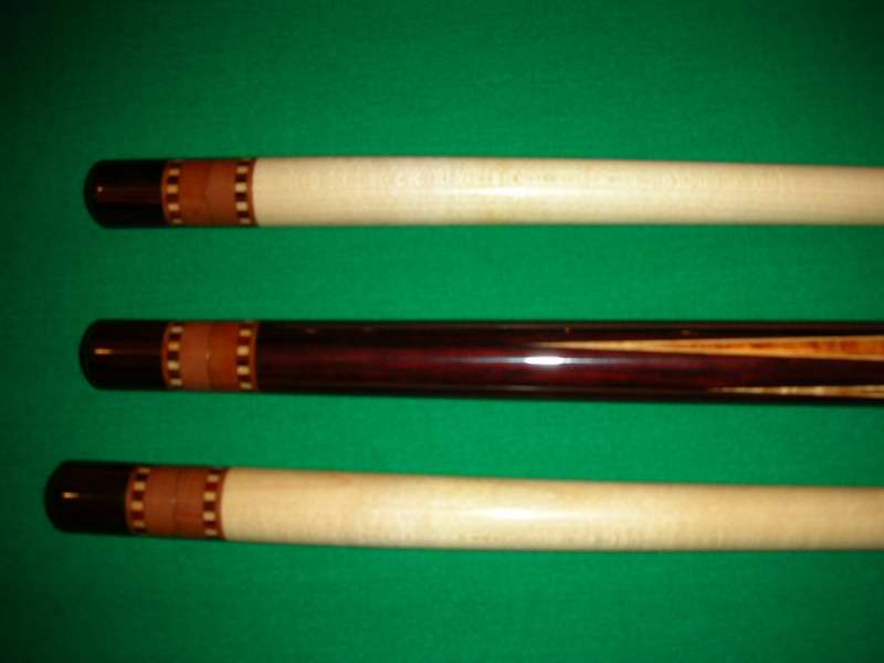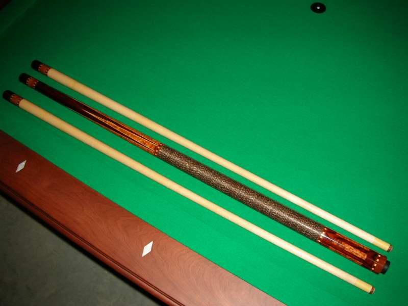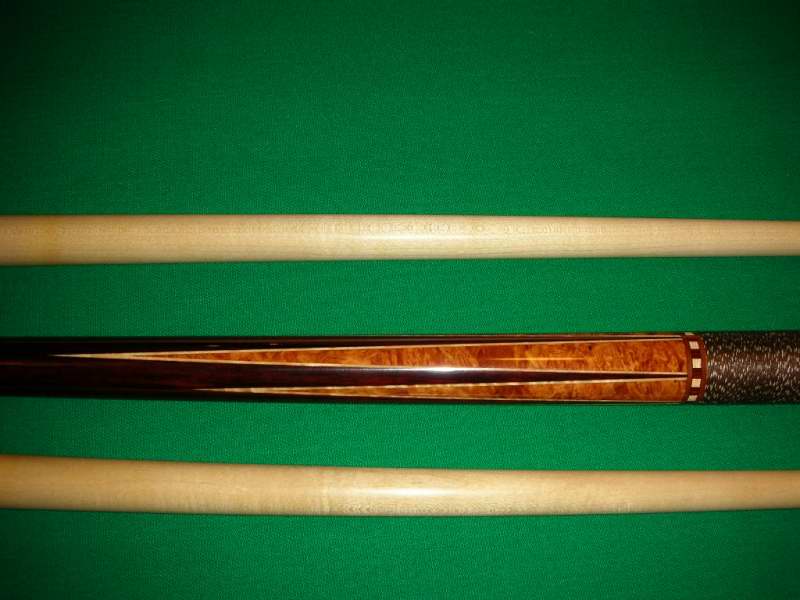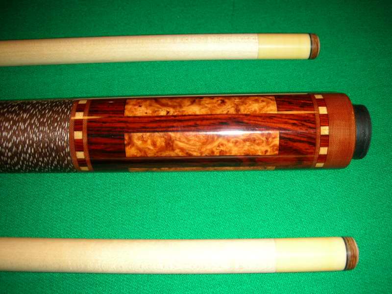 Very nice cue. I have a Bluegrass I just got back from Richard. He did a leather wrap. Very similar style to yours, six points and six windows. A few listings down under yours in the Cue gallery. Different woods, but same style. His cues hit great-