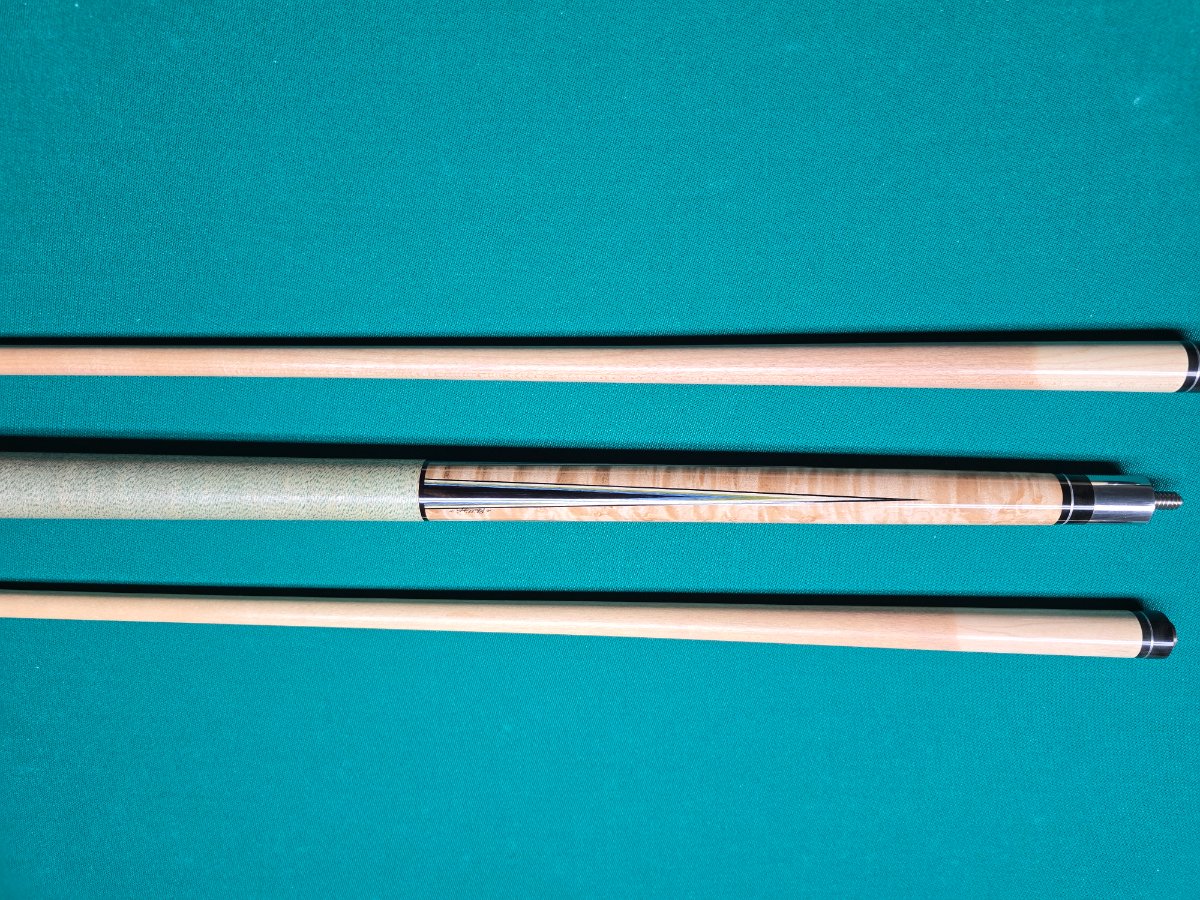 This cue is a great example of Richard Phillippe’s work. The cue points are absolutely perfectly made with ebony veneers with light blue accent going into a curly maple forearm . It is a piloted 5/16-14 stainless steel joint. The cue is 58” split evenly between butt and shafts. Two 13mm shafts with ivory ferrules with LePro tips. Everything rolls straight, apart and together. There is not a dink or mark on the butt or the shafts. Beautiful Irish linen wrap that looks like it could have come out of the shop yesterday. The Butt 15.1 oz. and shafts are both 3.7oz. This cue is both for the serious player serious collector. $ 2750.00 O/B/O