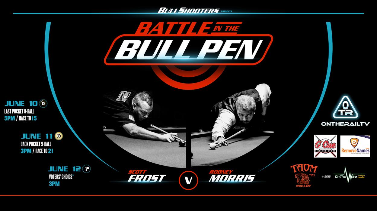 Hi pool fans. Today Scott Frost and Rodney Morris will be playing straight pool to 350 points at www.ontherailtv.com around 3pm MST. Tune in and watch some free pool, this game was picked by the fans voting at the venue. Its going to be a good one. Some luck people will be winning a free Adam cue worth $500 from G Cue Billiards and a two night stay at Casino Del Sol. We will be drawing for several prizes so get your name in the box at Bull Shooters, you must be present to win.