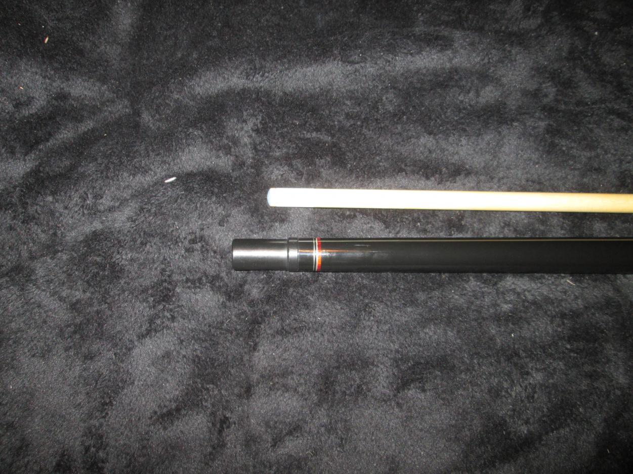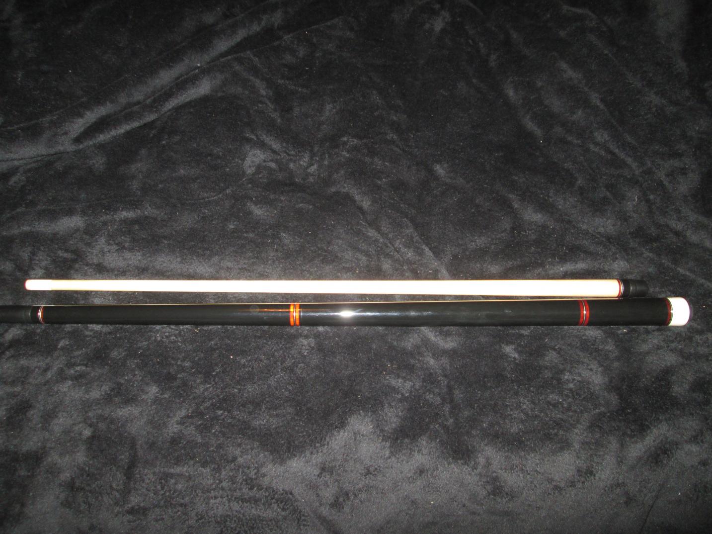 Its a Ron Benedict break cue and it hits a ton. It's made of Ebony with what I believe are cocobolo rings in all locations.