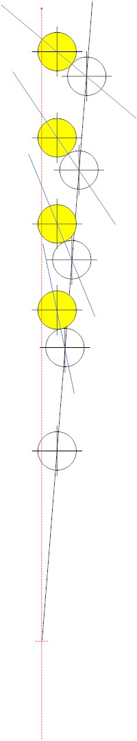 The red line is the 90-90 line. The black line is the cue stick, pivoted at a 10-inch bridge length to the center of the bottom white cue ball. The blue lines are the cut angles you get with yellow object balls at different distances.