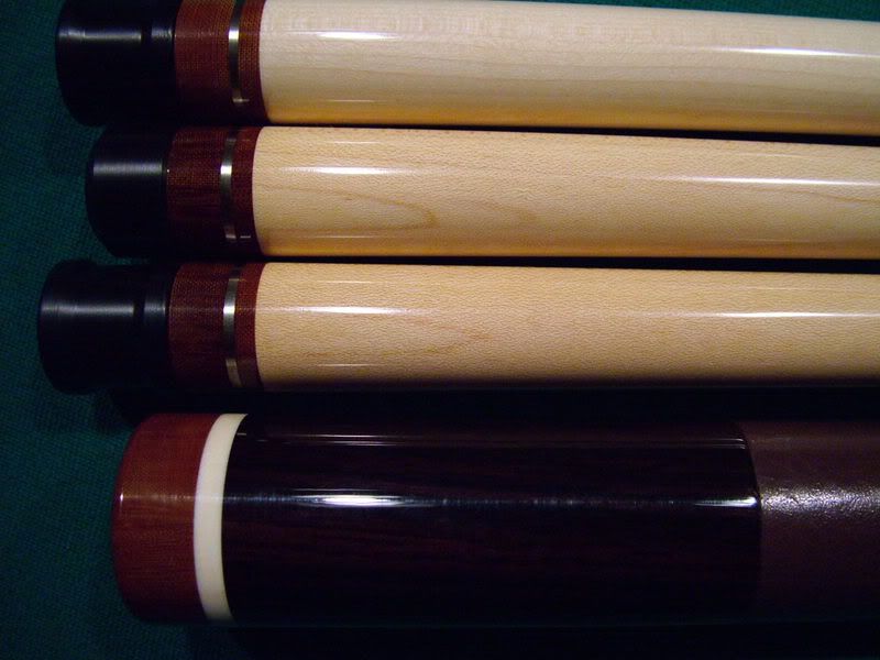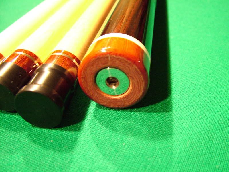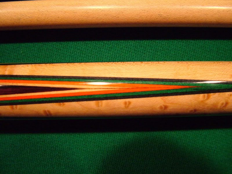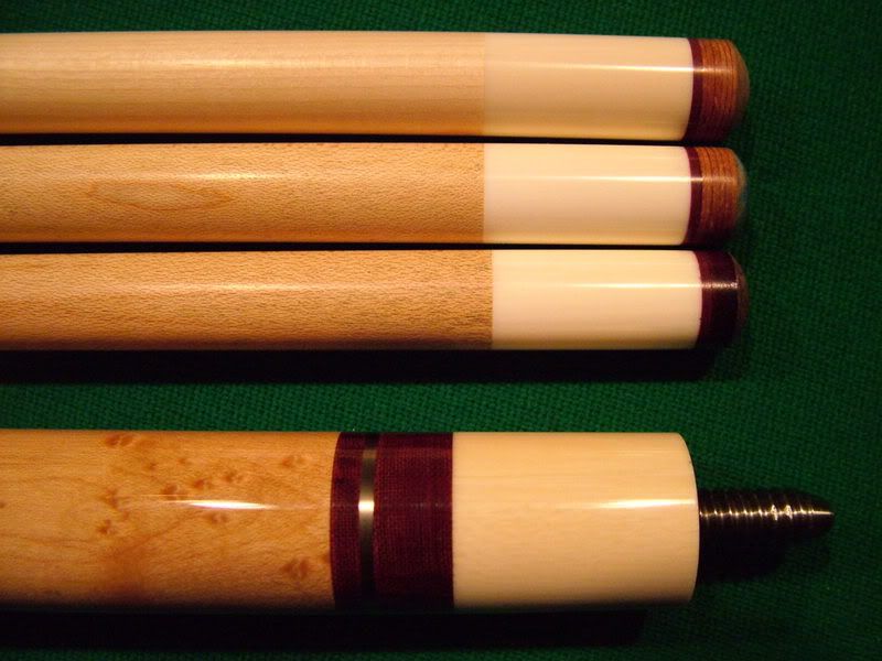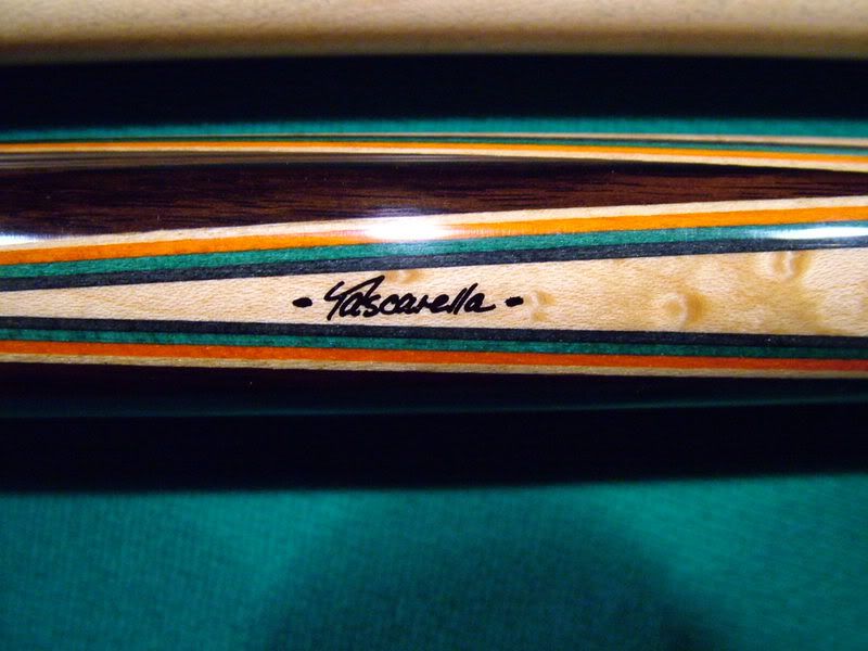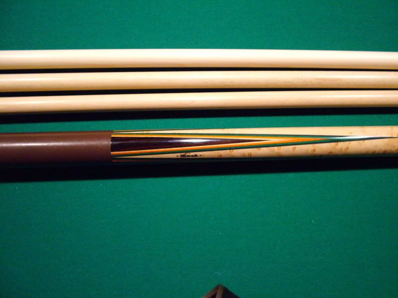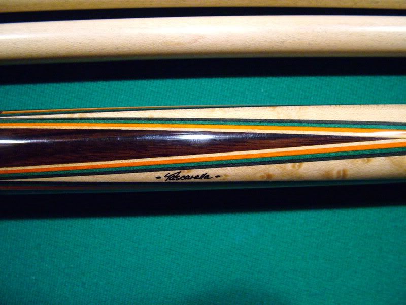 Rosewood Tascarella for sale. Piloted Ivory joint. Three shafts. One brand new at 13.10 mm. Two others like new at 12.75 mm. All roll straight. All white is ivory on the cue. 19.4 oz with two shafts and 19.0 oz with the third. Smooth brown leather wrap. The cue is like new with no marks on it anywhere! The veneer colors are black,spruce green,red-orange, and maple. Cue plays great!