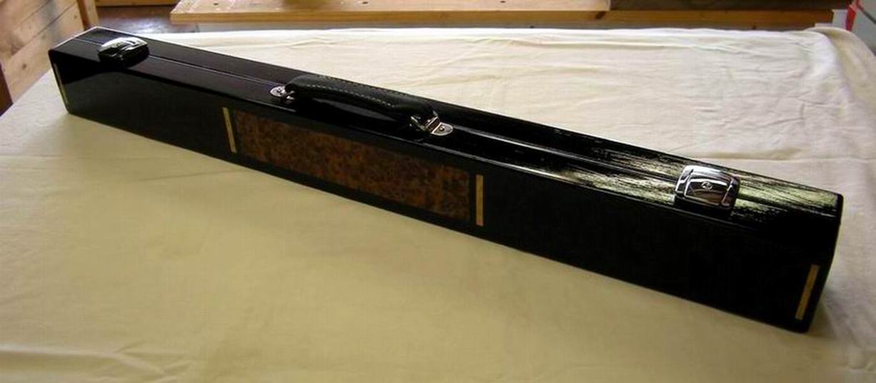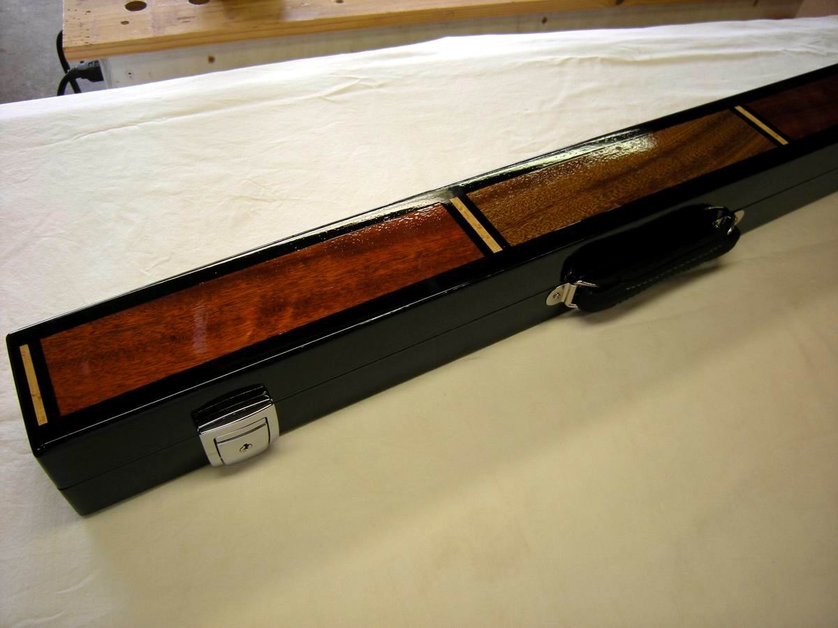 LINED IN BLACK FELT ,NICKLE HARDWARE WITH A BLACK NYLON CARRYING STRAP.NICKLE CORNER PROTECTORS ,AND HOLDS 3BUTTS AND 4 SHAFTS WITH EXTRA SPACE TO HOLD CHALK AND OTHER ITEMS.COMES WITH 4 SHAFT TIP COVERS TO HELP KEEP THE CASE CLEAN. ASKING $245.00SHIPPED IN THE U.S.A. I CAN ADD A BLACK HANDLE IF YOU WANT TO GIVE YOU THE OPTION OF HANDLE OR CARRY STRAP. REALLY NEED TO SELL THIS BABY TO MAKE UP FOR LOST TIME.IT'S TIMES LIKE THIS THAT MAKES ME ALMOST WANT TO JUST QUIT THE CRAFT.http://RHTCUSTOMWOOD.COM THANKS FOR NOW - ROGER RHTANDCOMPANY@GMAIL.COM