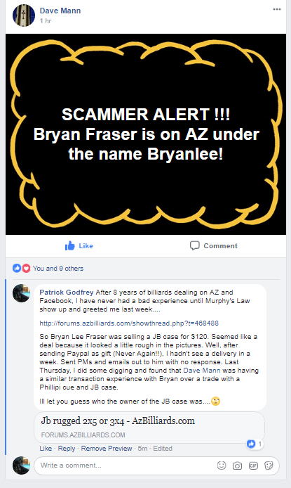 After 8 years of billiards dealing on AZ and Facebook, I have never had a bad experience until Murphy's Law showed up and greeted me last week....
