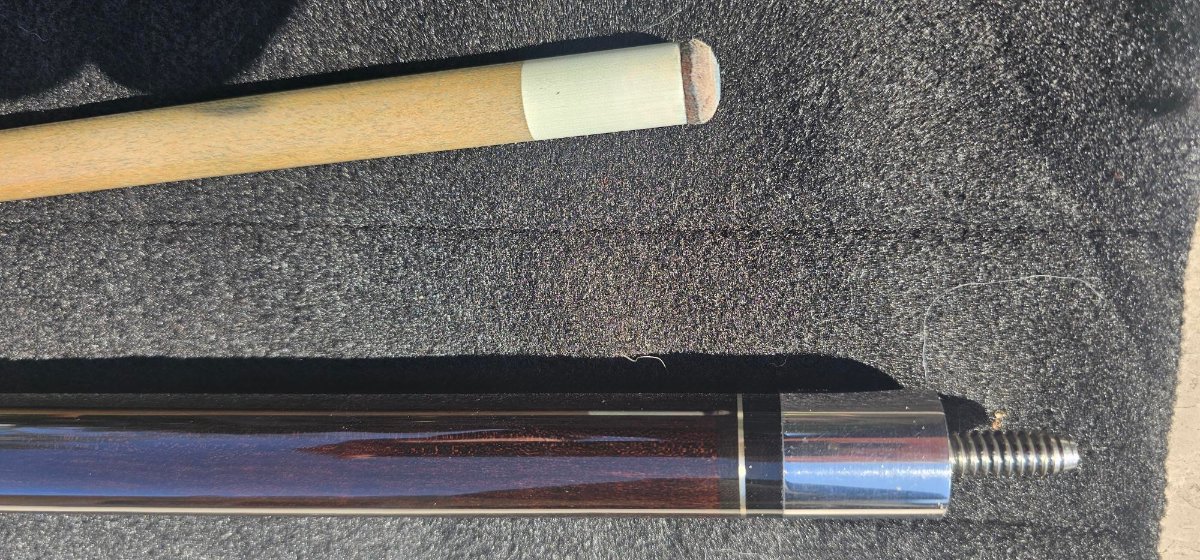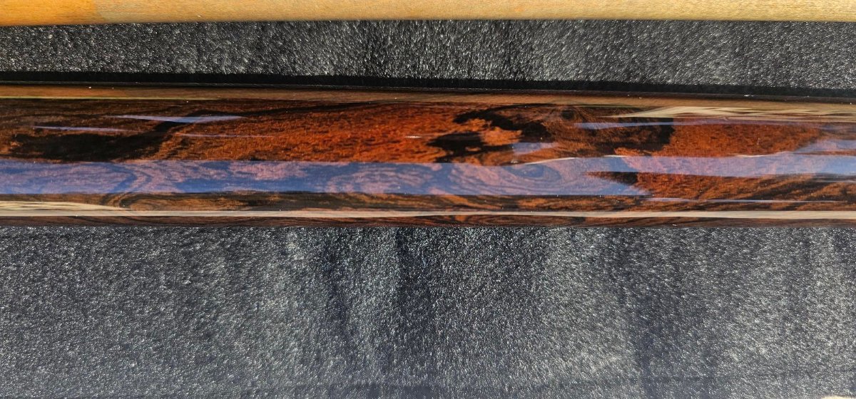 Rare offering here. Schon CX 65 wrap less with 5/16-14 joint. Ebony butt and forearm with highly figured Cocobolo handle. Fancy ringwork in 3 places. Shaft is 29 inches at 4.02 oz Butt is 29 inches at 16.22 oz. Butt rolls straight, shaft rolls fairly flat, can't say it's absolutely perfect but certainly would not affect playability. Very bottom 1.5 inch butt cap has minor clear coat hazing. Schon joint protectors included. Shipping and insurance paid by seller $1200