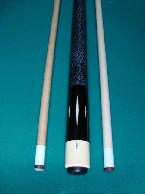 Butt-section - Birdseye maple forearm and an ebony butt-sleeve. 4 ebony points with large ivory diamonds. butt-sleeve has 4 large ivory diamonds and 4 small ivory stars. 5/16x14 joint screw, 14.8oz, this cue could pass for being new; with one small blemish at the butt-sleeve.