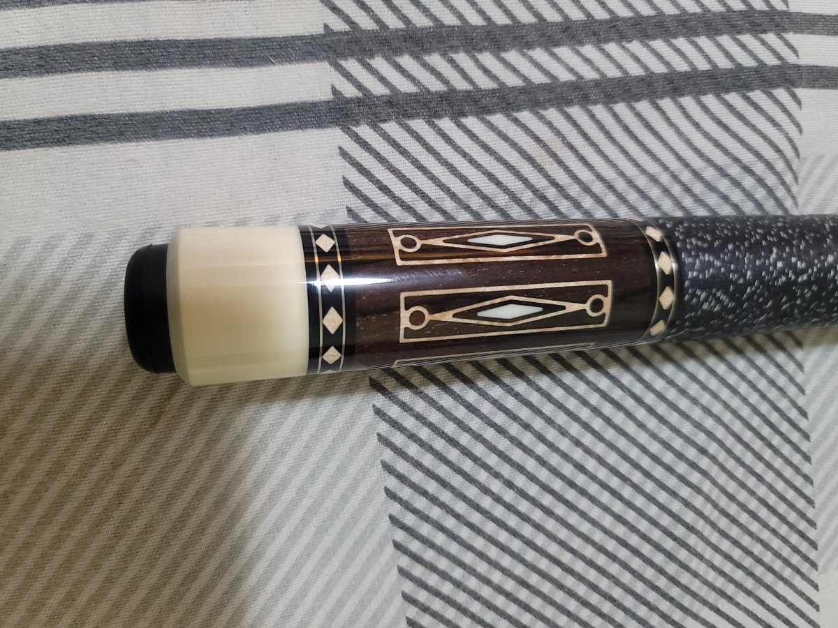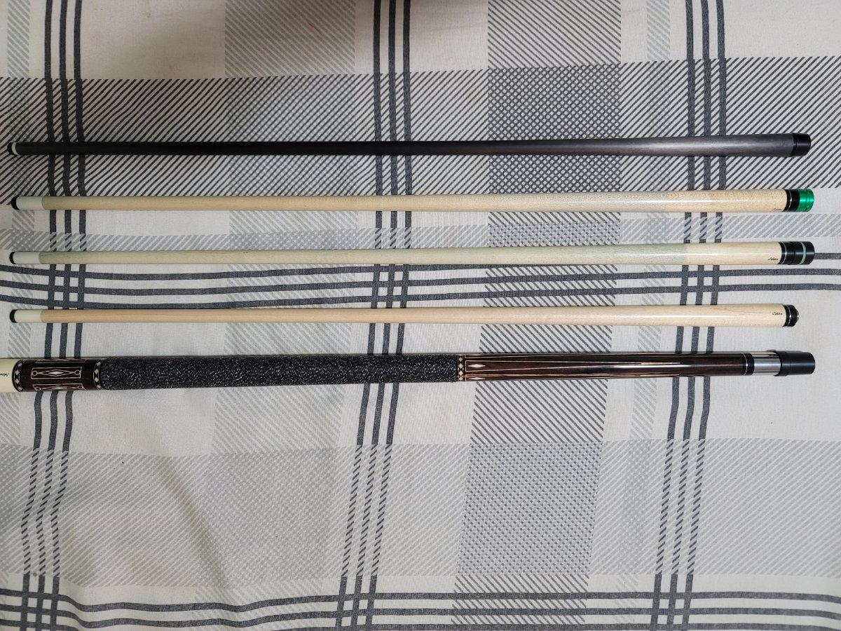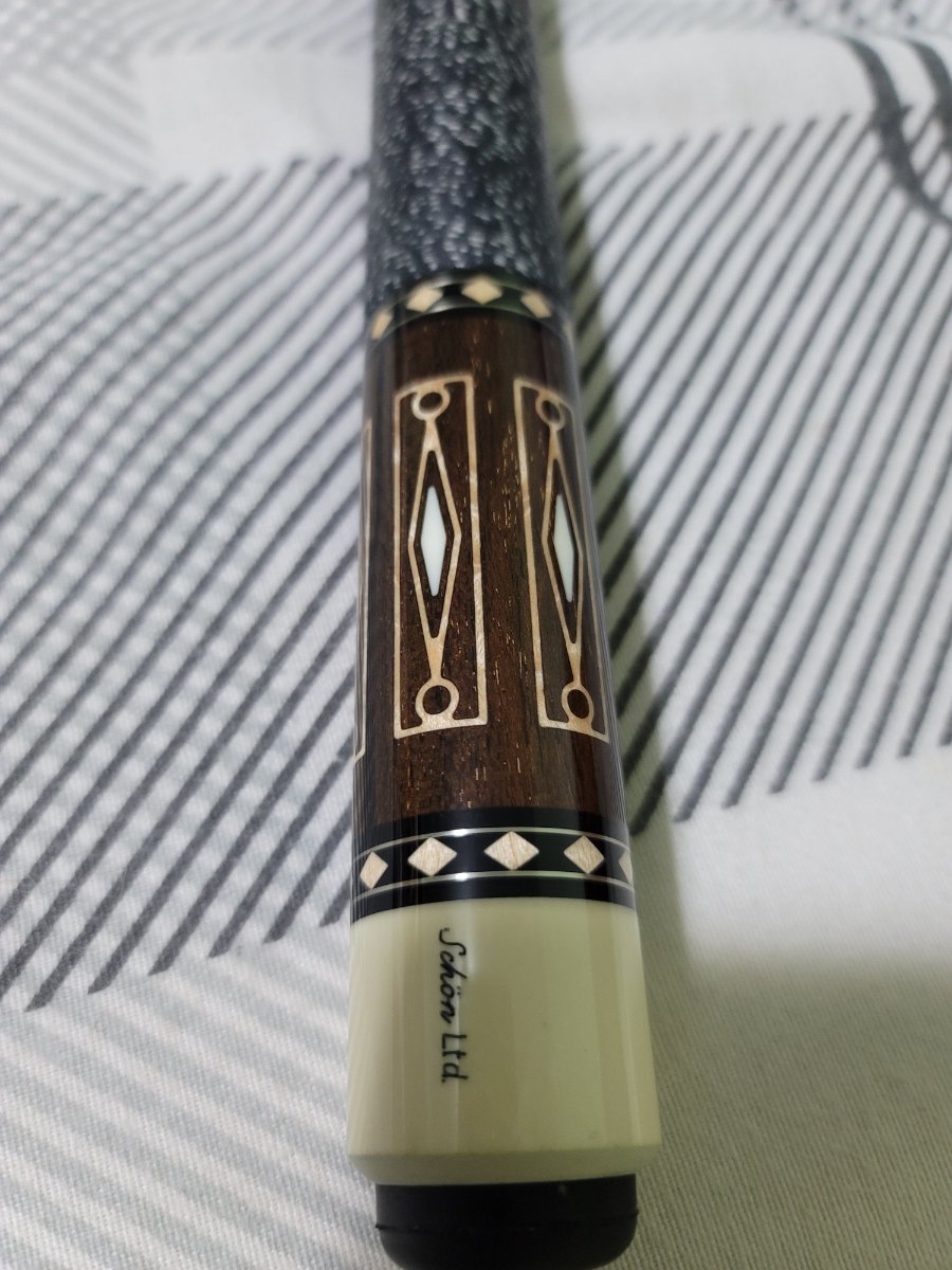 I am selling my Schon LTD. I think it is a 2306. The original owner had it in a collection and never used it, only test hit. I have played 5 games with it. There are 4 shafts, 1 original and 3 that are from my broken Schon CX03. The original 13 mm Schon shaft has never been chalked, it does have a small high spot when rolled. Original 13 mm Schon shaft from CX03 has roughly 30 games on it with a Kamui Black Clear Hard tip. The 3rd Schon shaft I bought from Seybert's Billiard Supply and had them turn it down to 12.6 mm, it is at 12.5 mm after the ferrule from play, there is a small high spot when rolled and it has a Kamui Black Clear Hard tip. Last shaft is a 11.8 mm Jacoby Black v4 carbon fiber with a with a Kamui Black Clear Hard tip. There are 2 weight bolts and a bumper from my CX03 I will add as well.