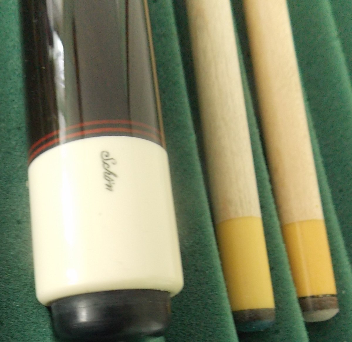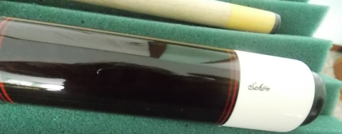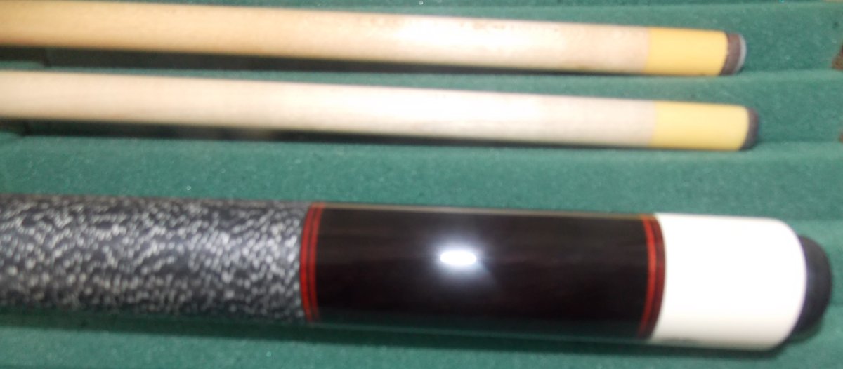 Ebony on Ebony w/ red veneers, 1 old micarta shaft. very collectible. butt 16.2oz [can be lowered] shaft 4.0oz, 13m butt & shaft roll straight $2,100 Call Don 989-305-6454 if no answer leave message. email suremancues77@gmail.com, or leave message
